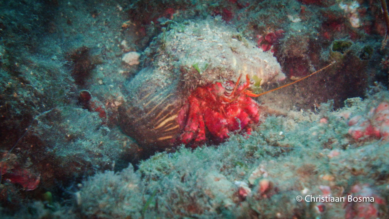We waren alweer wat verder gedoken totdat de instructeur iets spotte. Het was een Heremietkrab. Deze krab was erg goed gecamoufleerd en ik had hem eerst niet eens opgemerkt. Het beestje leek een beetje bang voor ons te zijn, want hij rende aardig hard weg van ons vandaan. Toch heb ik een paar foto’s van deze krab kunnen maken.