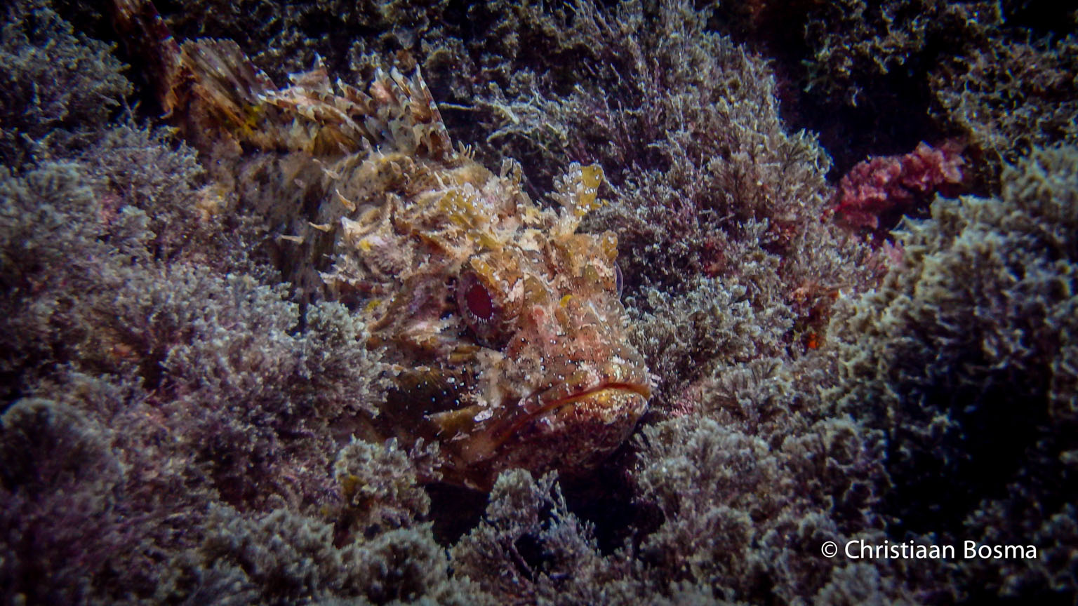 Wel kwam ik gigantisch veel steenvis tegen wat zich verschool tussen de begroeide waterplanten op de rotsen. Ik zag op een gegeven moment een rots aankomen en ik heb geleerd bij mijn PPB (Peak Performance Buoyancy) specialty om je longen te gebruiken. Ik nam dus een grote hap lucht en zon anderhalve seconde later ging ik vanzelf omhoog. Ik zweefde mooi net boven de rots en blies mijn lucht weer uit om een neutraal drijfvermogen te krijgen totdat ik plots een steenvis tegenkwam. Gauw nam ik weer een hap lucht en nam mijn camera bij de hand op hier een foto van te maken. Deze foto is naar mijn idee zeer gelukt en is hieronder te vinden.